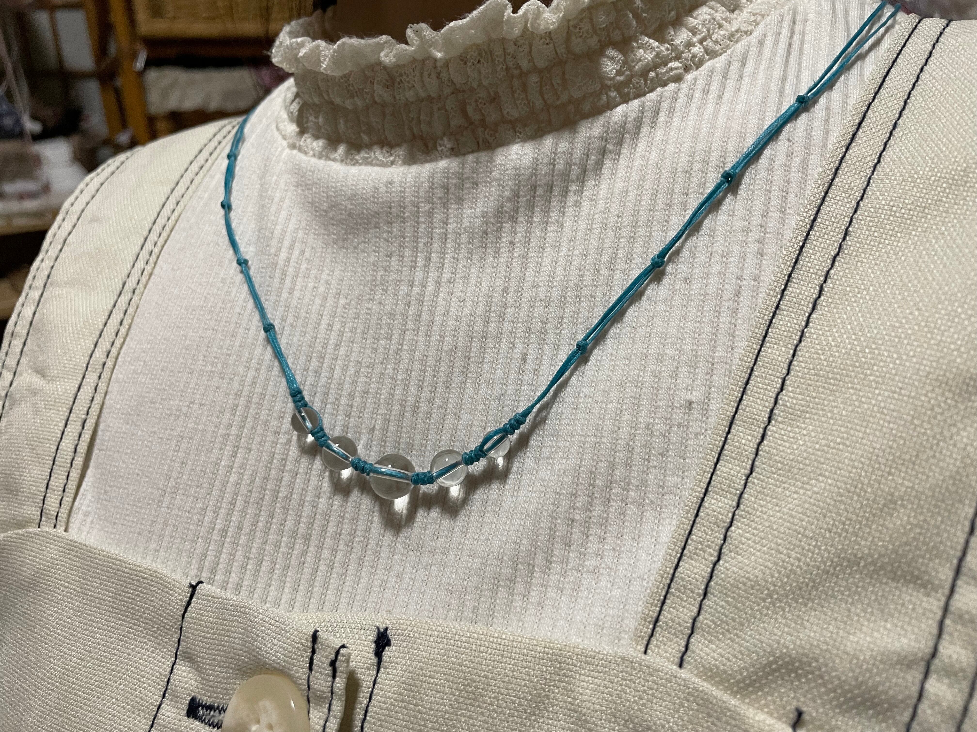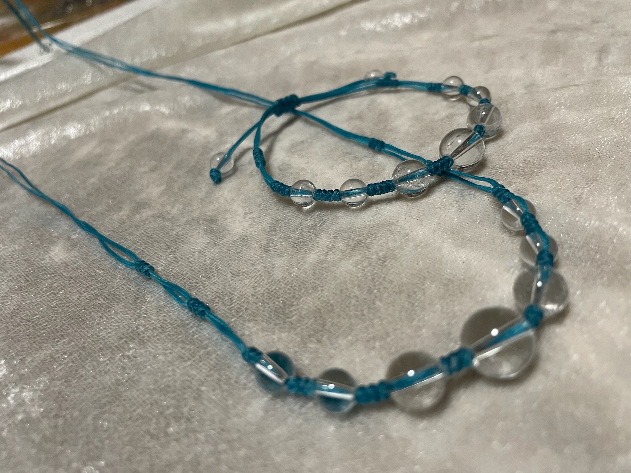 天然の水晶を使用し、一つ一つ紐で編んで繋いでいます。